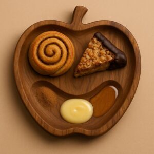 Ponudba (Vanilijev kolaček in Čokoladno orehov-medeni kolač, postrežena na “jabolčnem krožniku” iz lesa s prilogo cimeta, vanilije in medu)